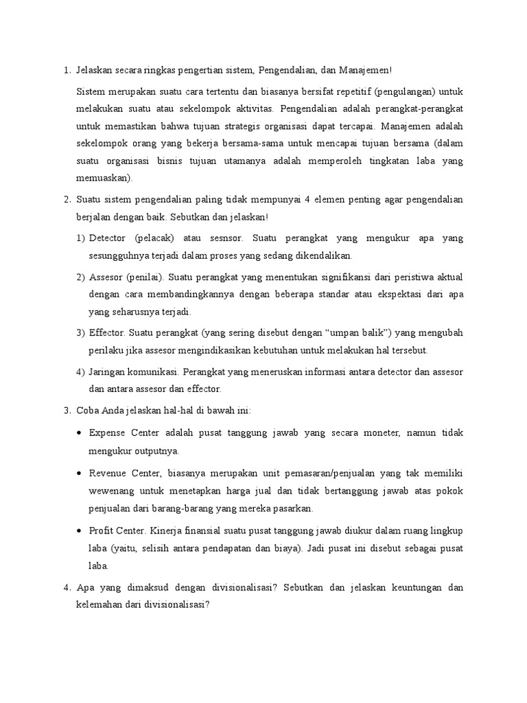 Manager dari pusat tanggungjawab produksi rutin dapat dikendalikan dengan relative ketat atau longgar dan pengendalian actual mencerminkan gaya dari atasan manager. Kumpulan Soal Pilihan Ganda Audit Dan Pengendalian Manajemen Sistem Informasi 7686 views Soal Pilihan Ganda dan Kunci Jawaban Pelajaran Sistem Komputer untuk SMK Kelas 1. Pengendalian manajemen memerlukan koordinasi antaara individu 4.